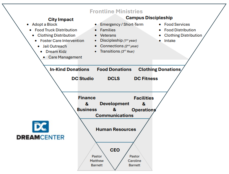 This role is shaped by the Dream Center’s Upside-Down Servant Leadership Pyramid, which teaches that leaders exist to serve staff, staff exist to strengthen frontline ministries, and all roles exist to serve the people we care for