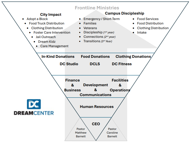 This role is shaped by the Dream Center’s Upside-Down Servant Leadership Pyramid, which teaches that leaders exist to serve staff, staff exist to strengthen frontline ministries, and all roles exist to serve the people we care for.